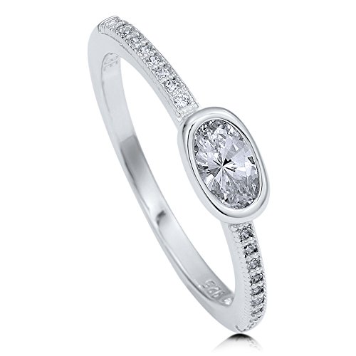 This solitaire with side stones ring is made of rhodium plated fine 925 sterling silver. Features 0.43 carat oval cut clear cubic zirconia (6mm x 4mm) in bezel setting. Accented with 0.09 ct.tw round cut clear cubic zirconia in micro pave setting. Band measures 2mm in width. Imported. DISCLAIMER: All cubic zirconia stone weights are approximate and listed as diamond equivalent weight in carats. Jewelry is not intended for children under 13 years of age. Photos may be enlarged to show details.